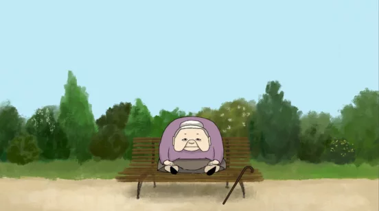 Une vieille femme est assise, toute recroquevillée, sur le banc d'un jardin public.